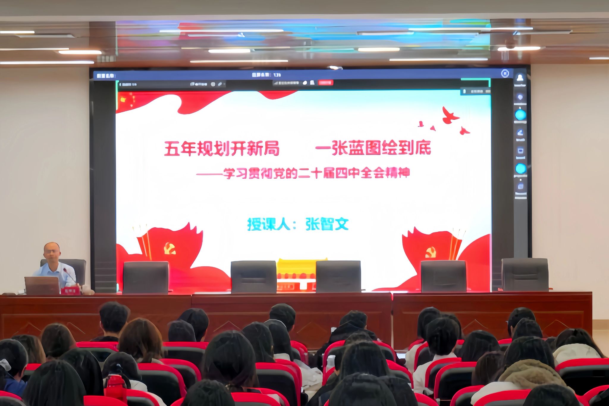 首先,中共漳州市委党校统战理论教研部主任、副教授张智文以《五年规划开新局,一张蓝图绘到底——学习贯彻党的二十届四中全会精神》为题,从全会召开的时代背景、核心要义、战略部署等维度展开系统解读,深入浅出地阐释了国家发展规划的连续性与前瞻性,引导党员们精准把握时代发展大势,进一步增强服务国家发展大局的自觉性和坚定性。