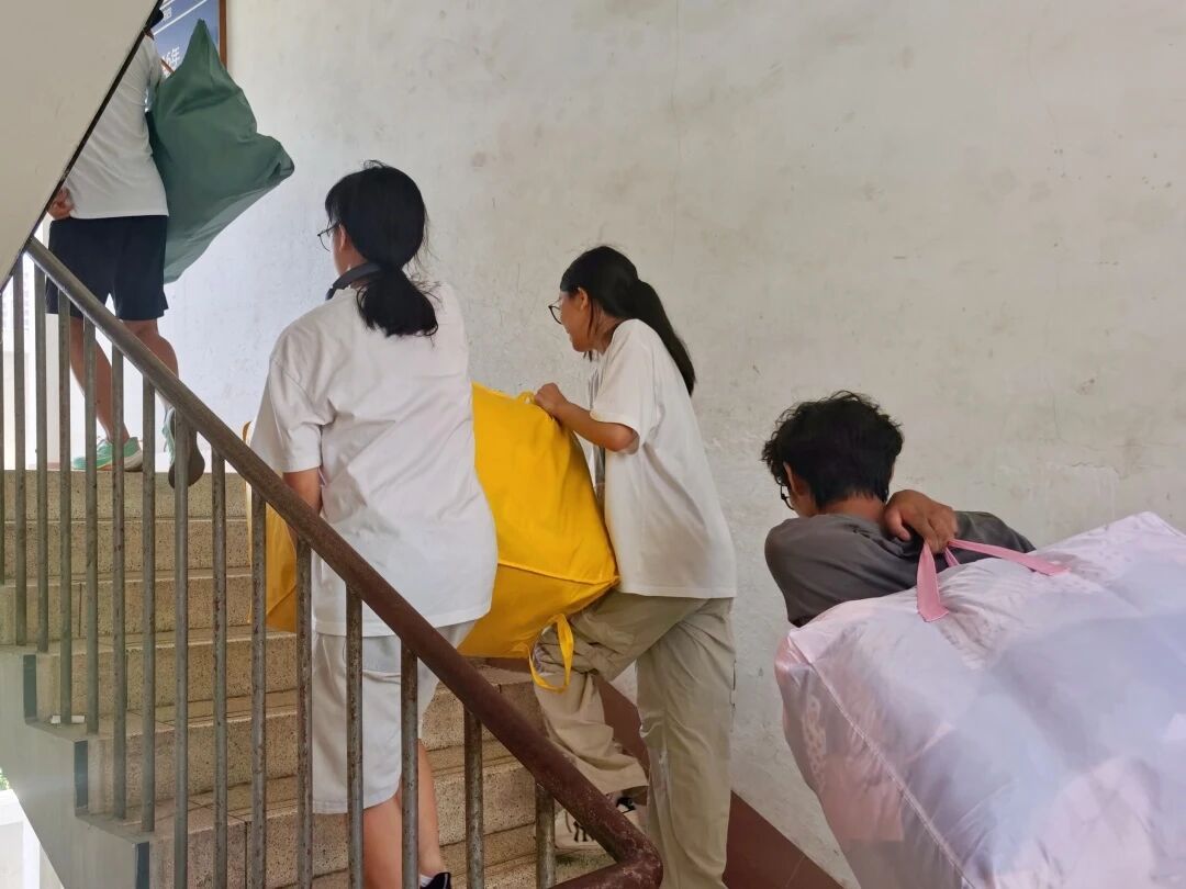 骄阳似火,搬迁现场热火朝天。志愿者们穿梭在宿舍楼间,帮同学打包行李、搬运物品;后勤人员驾驶车辆,往返于校区间转运物资。