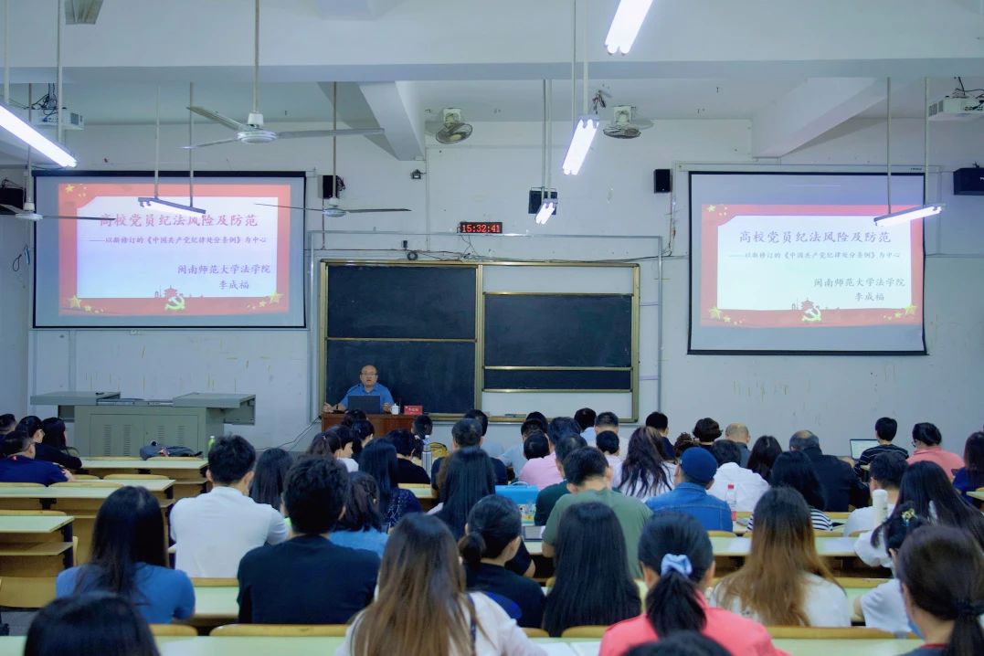 法学院李成福老师应邀为我院师生党员作《高校党员的法纪风险及预防——以新修订的 <中国共产党纪律处分条例>为中心》的专题党课。李成福老师从新修定的《中国共产党纪律处分条例》解析、高校典型违法违纪案例、警示与预防三个方面展开,以《条例》修订的基本情况为切入点,重点围绕从《条例》角度看高校党员纪法风险展开讲解。